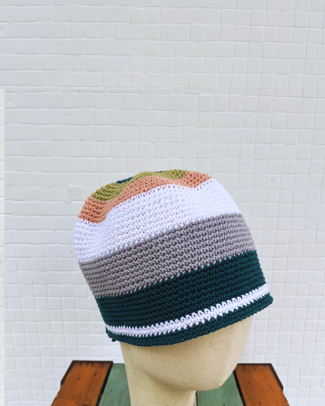採用台灣100%棉線,手工鉤針編織,溫柔淡粉,灰,墨綠配色,Tam無帽沿帽型,搭民神秘圖騰洋裝,混搭工裝風格,是充滿活力的 BOHO風格。