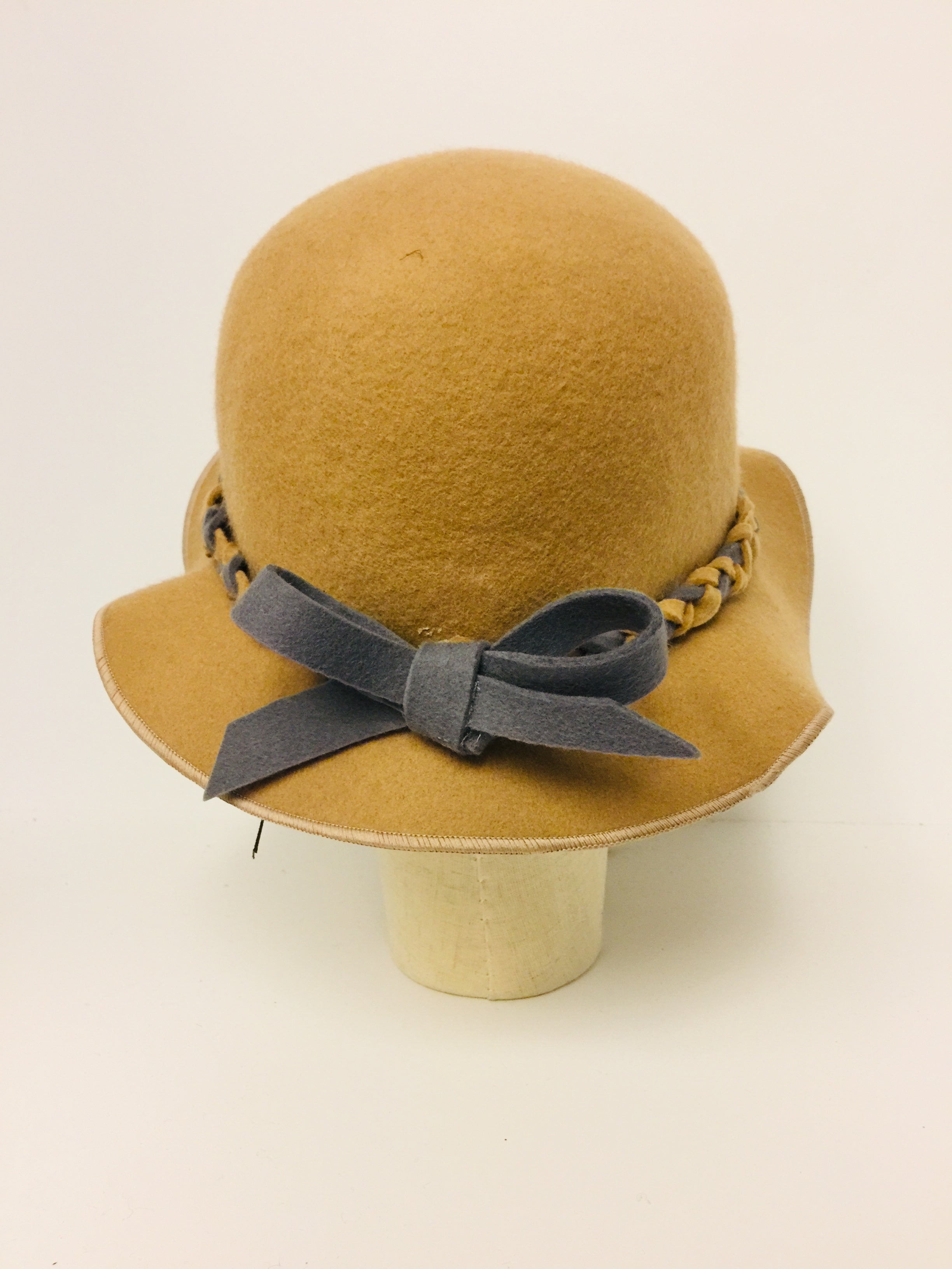 駝色羊毛有著暖和舒適的色調,帽型是圓頂短沿帽,帽帶是駝灰交錯編織,尾端是灰色蝴蝶結收尾,駝色的小圓帽。